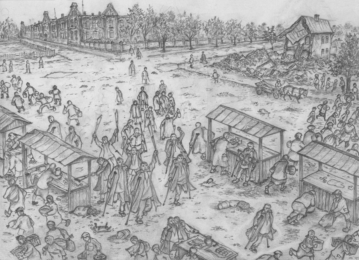 Зарисовку базарных будней в 1944-1945 гг. сделал словами и карандашом В. Губенко. Базар находился в непосредственной близости от школы №5, где он учился. Сбегать на базар во время перемены было обычным делом. Некоторые, особенно те, кто прошел школу выживания во время немецкой оккупации, умудрялись еще успеть провернуть там какой-никакой «гешефт».